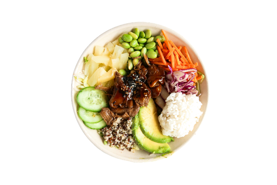 Hawaiian chicken with pineapple, carrot, edamame, cucumber, avocado, quinoa, cabbage, white sushi rice on shredded lettuce base with roasted sesame sauce