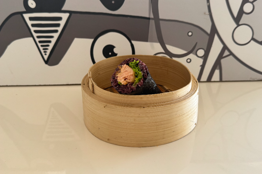 Spicy teriyaki salmon sushi roll (black rice)